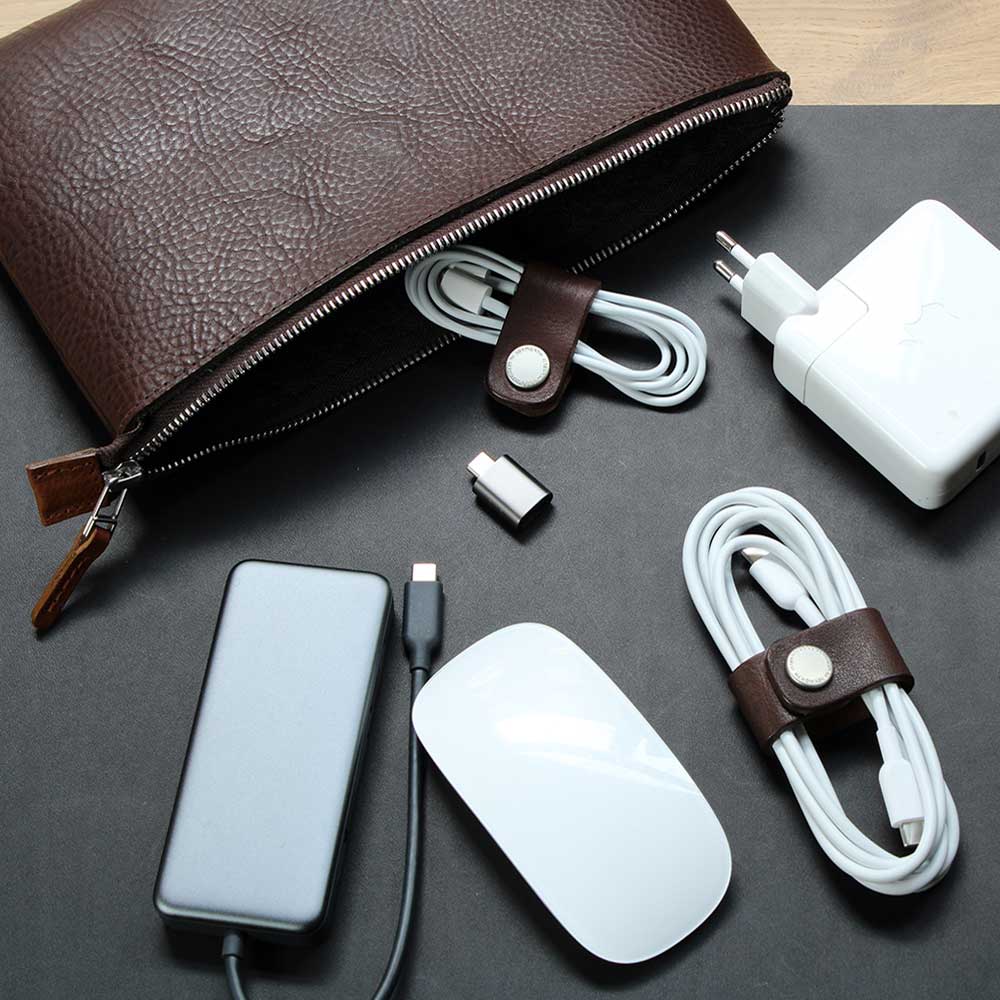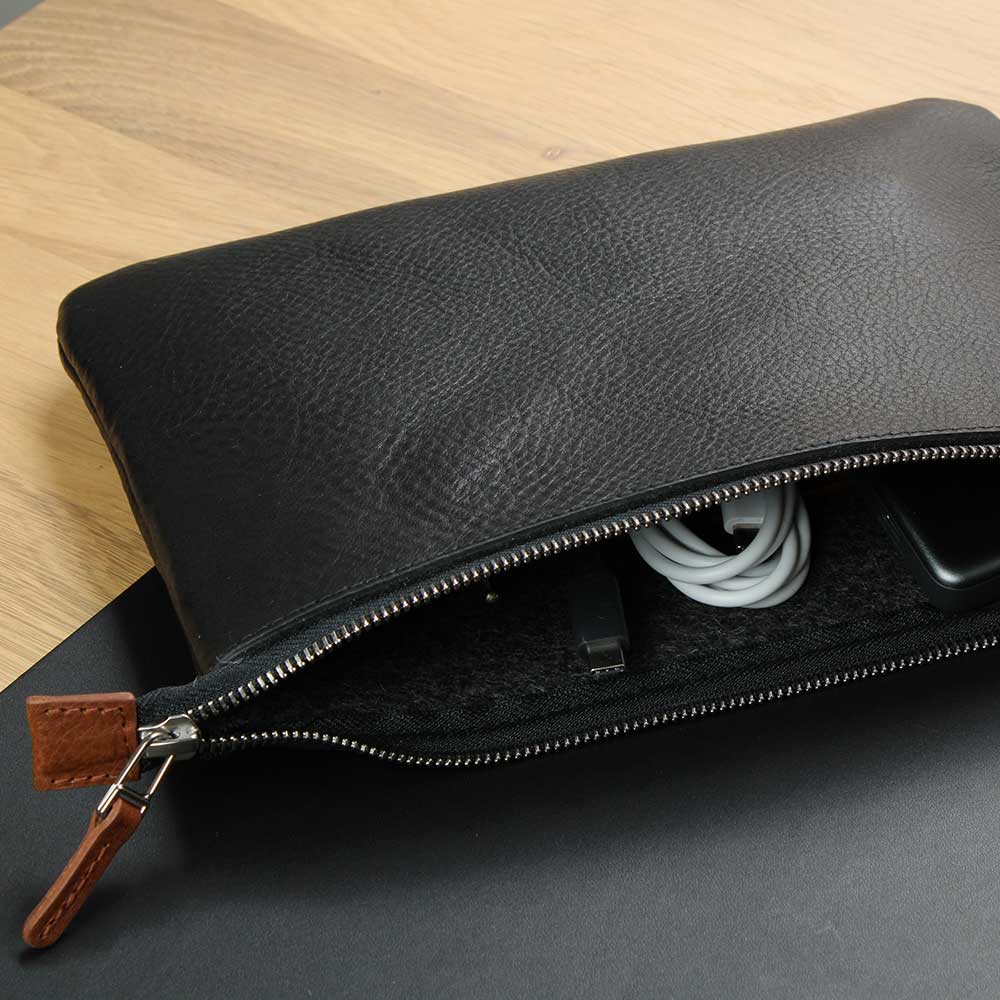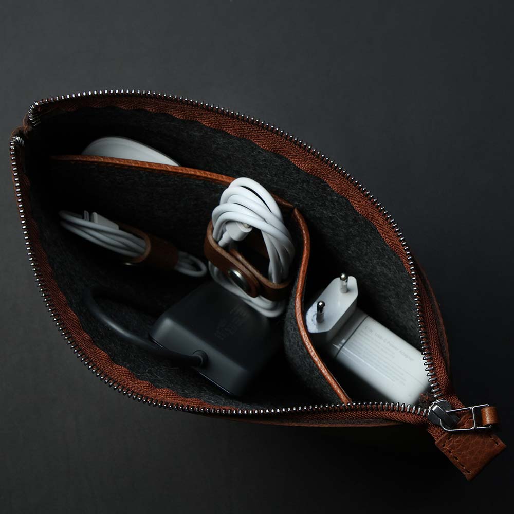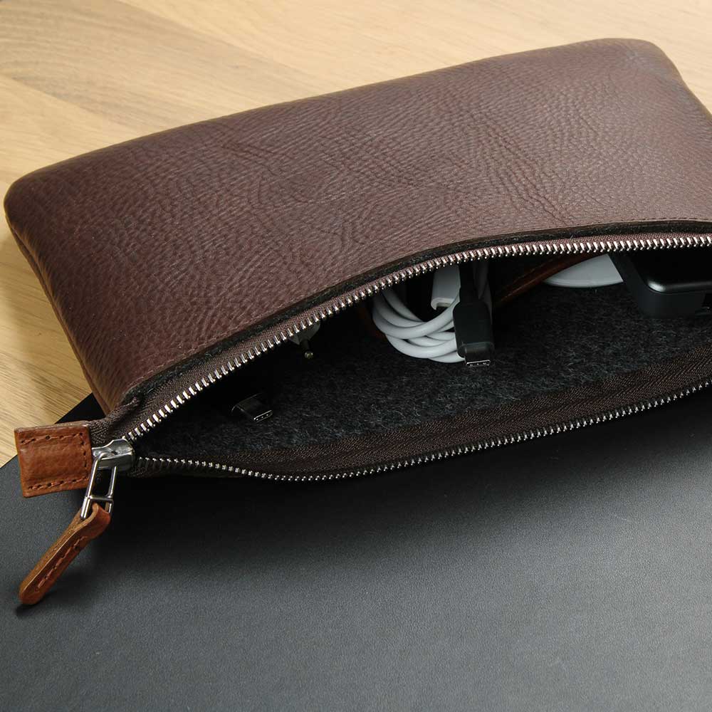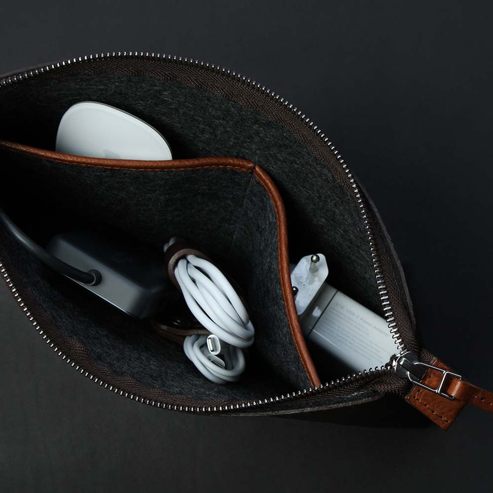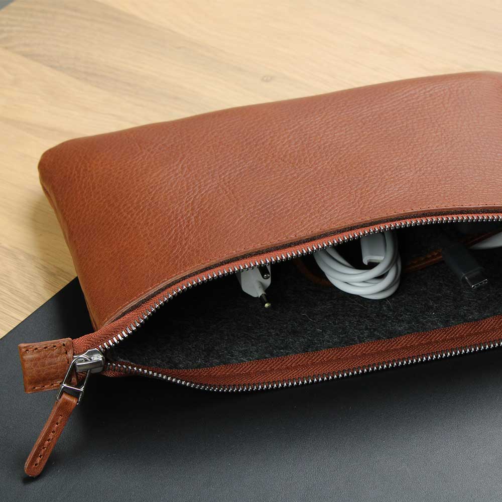 Die Organizer Tasche besteht aus pflanzlich gegerbtem Leder aus Italien, gefertigt in der renommierten Gerberei Conceria 800, ganz ohne den Einsatz von Chemikalien.